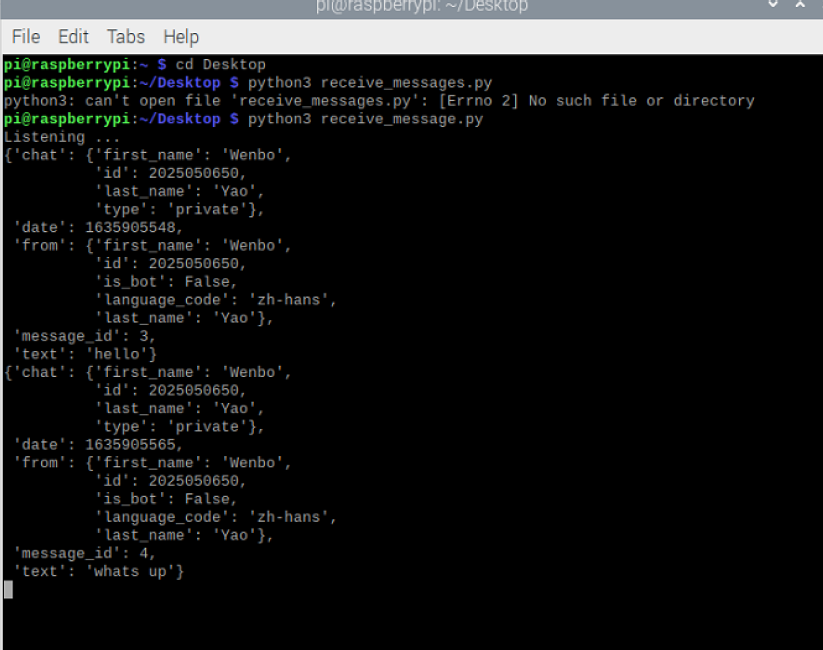 一旦我们获得了用户的聊天ID,我们就可以编辑信息并将其发送给特定的用户。下面演示向特定用户发送消息的程序,你可以编辑chat id以及bot.sendMessage函数的两个参数中的文字。