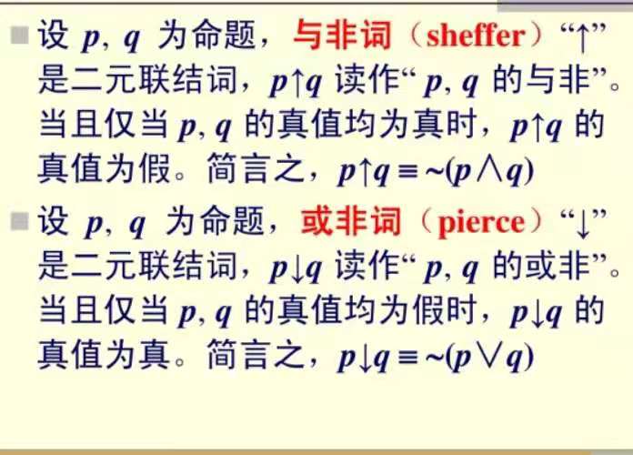 - 否定联结词的含意相当干自然语言中的“不”、“没有”、无”、“否定”,“井非”“取反"等