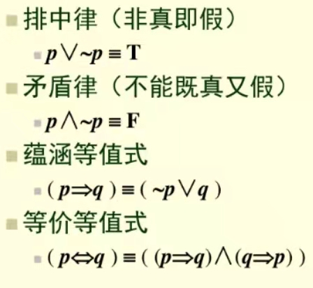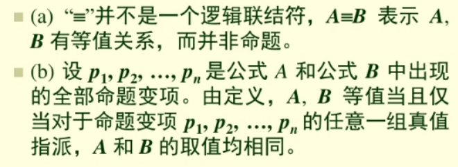1.设A,B为两个命题公式,若A<=>B为一个重言式,则称A与B等值或逻辑等价,记作A ≡B,称A≡B为等值式