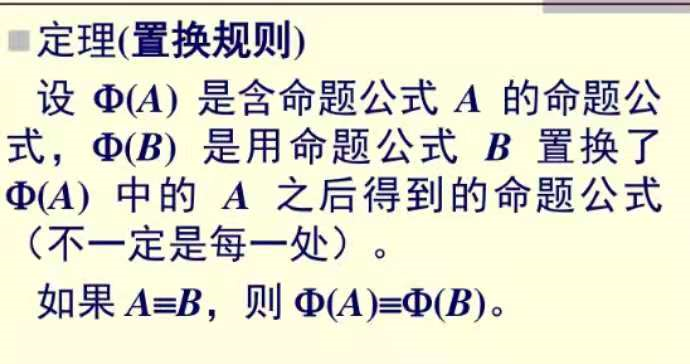 - 假设A是一个重言式,对其中所有相同的命题变项都用同一命题公式进行代换,所得到的结果仍为一重言式