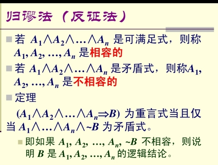 - 一个合取范式是重言式,当且仅当它的每个析取式都是重言式,即每个析取式至少包含一个互补对