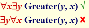 这组等值式表明相同量词与排列的次序无关,但是对于不同量词,不能随意更换次序,即("x)($y)A(x,y)与($y)("x)A(x,y)不等值