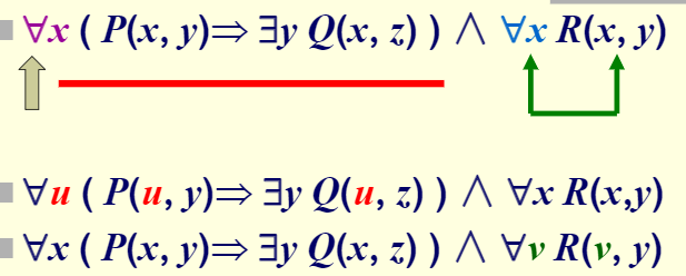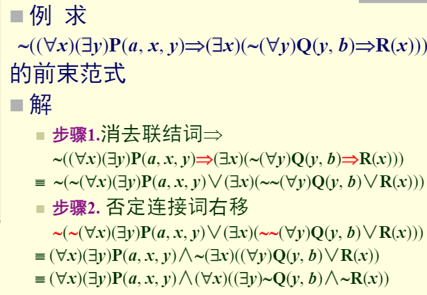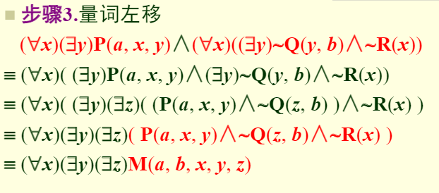 步骤3.将谓词公式中的量词左移(使用量词分配等值式、量词辖域收缩与扩张等值式),必要时将变项改名