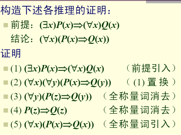 ■而所使用的推理规则除命题逻辑的推理演算中用到的几条基本推理规则外,还包括四条有关量词的消去和引入规则: