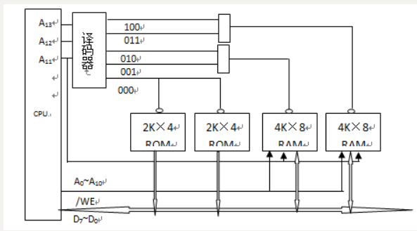 3.RAM芯片数量=8KB/(4K×8)=2片,字扩展