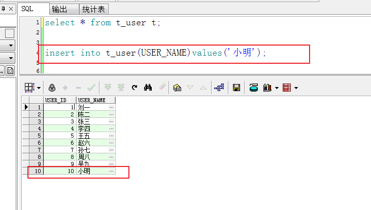 user_id为10的记录,insert语句并没有为user_id字段赋值,但是记录中是有值的,利用触发器在数据插入之前将序列的值自动赋给新的记录。