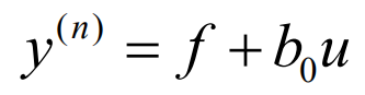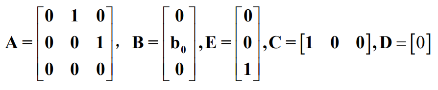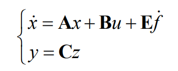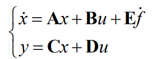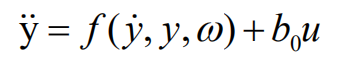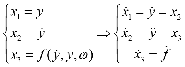 y为输出,u为输入,x1、x2和x3为状态变量,x3为扩张状态(状态变量数=系统阶数,二阶系统所以x3成为扩张状态),w为扰动,f为总扰动,扩张状态空间方程:
