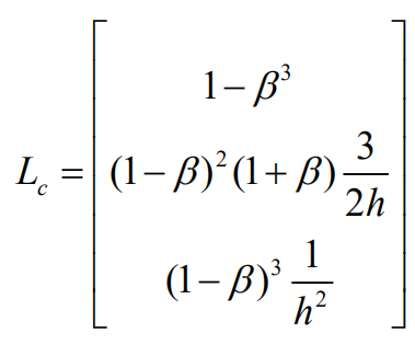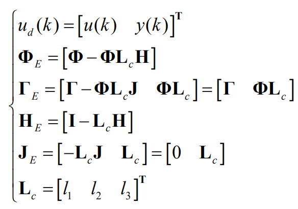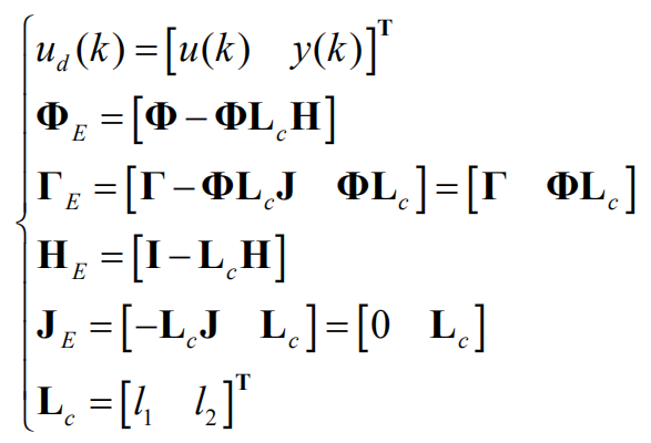 离散估计器方程如下,其中ud(k)为离散估计器输入组合,yd(k)为离散估计器输出,Lc为离散估计器误差反馈增益矩阵。