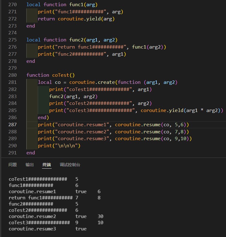 该方法的第一个参数为corotine.create()的返回值,其余参数如果是在第一次运行该协程则是传给主体,如果是接着之前挂起的协程运行则参数是传给coroutine.yield()作为coroutine.yield()返回值返回。