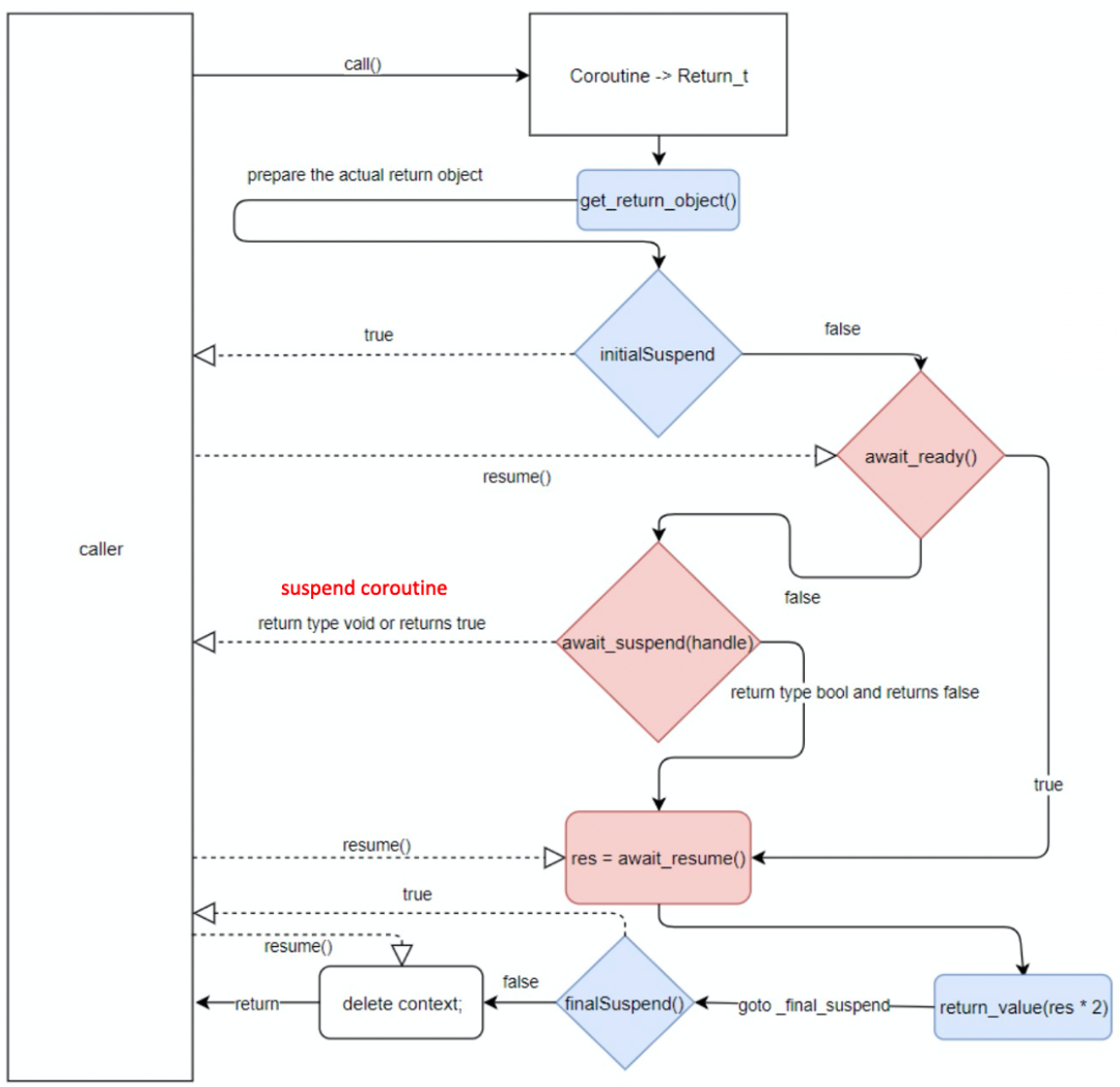 图中浅蓝色部分的方法就是 Return_t 关联的 promise 对象的函数,浅红色部分就是 co_await 等待的 awaiter。