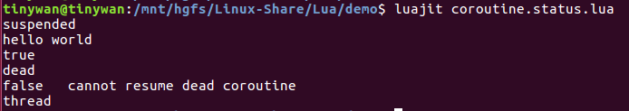描述:可以通过 coroutine.status 来输出查看协程当前的状态。