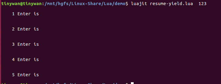 coroutine.resume(co) 上面第一个 resume 唤醒执行协程主函数代码,直到第一个 yield。第二个 resume 激活被挂起的协程,并从上一次协程被中断 yield 的位置继续执行协程主函数代码,直到再次遇到 yield 或程序结束。