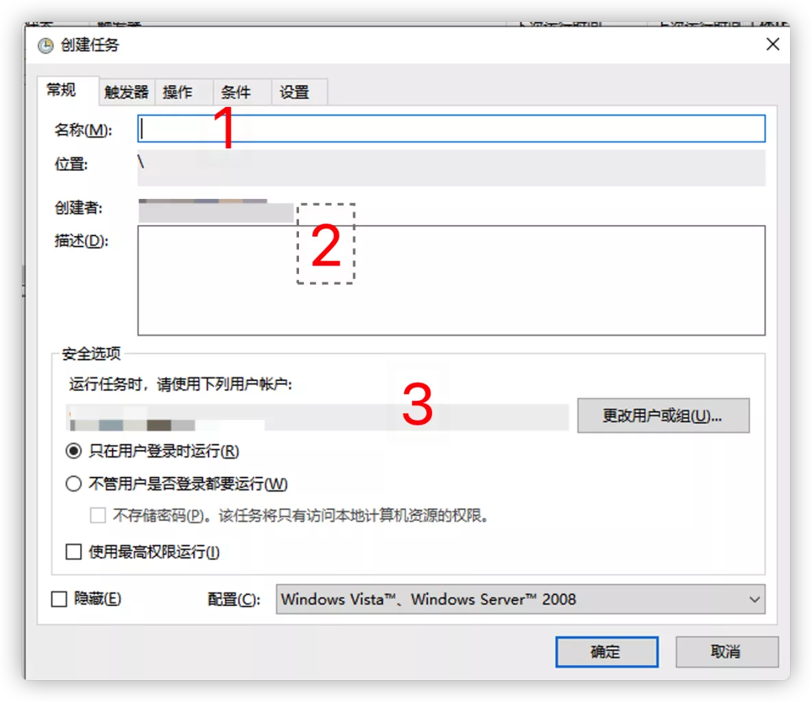 只在用户登录时运行:这个如名称,如果用户账户注销了,这个任务怎么也无法执行,用于一些需要输入账号密码,但是不方便输入的任务,因为本地你输入了账号密码,是会保存在任务计划中的。