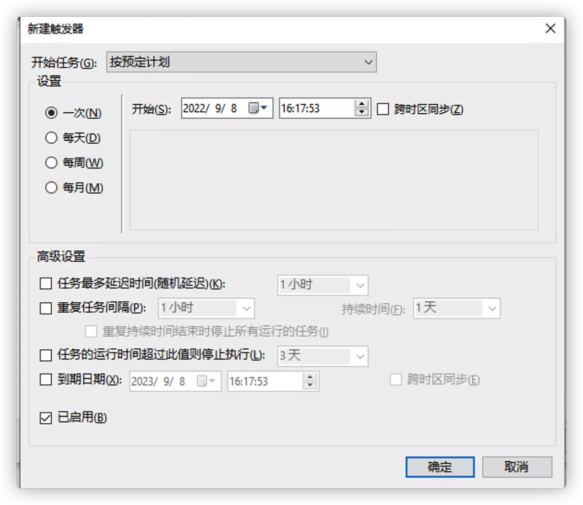 触发器里面具体的就分的很细了。可以做一次任务,也可以做周期任务。