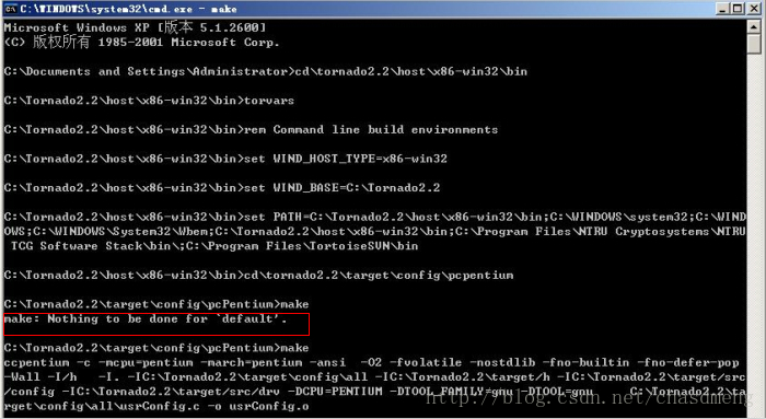 编译bootrom。本文选用命令行方式编译,CMD下进入tornado2.2targetcofigpcPentium,输入make 命令编译(若在执行make命令时遇到"make: Nothing to be done for 'default'."提示,常是由于Config.h文件在之前修改过程中代码没有对齐引起的,注意代码与行头间距一个“Tab”键)。如下图所示: