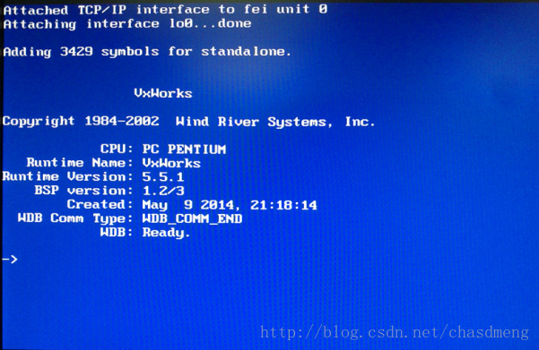 7、拔出U盘,重启PC104,bootrom可正常启动,之后本地加载VxWorks镜像文件,顺利进入VxWorks系统后如下图所示。