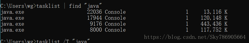 tasklist | find "关键字" 可以对结果进行过滤,find相当于linux下的grep,后面的关键字要加引号