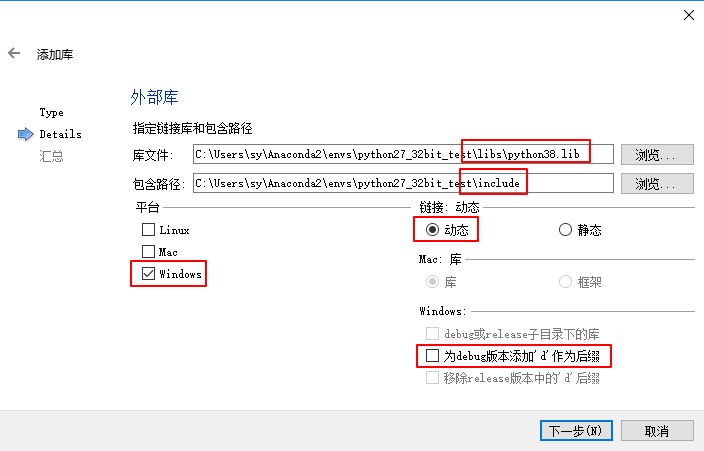 选择库文件和头文件路径,选择平台,选择动态链接