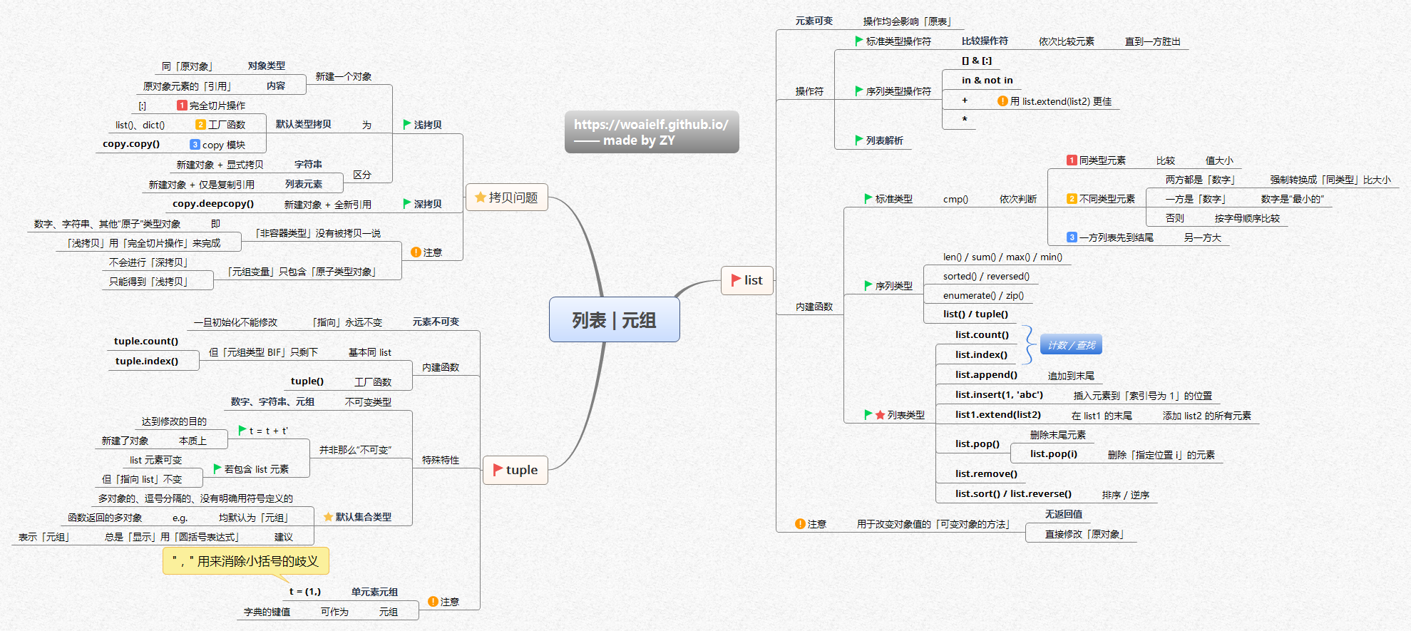 关于列表|元组,首先说拷贝问题,分深浅拷贝两种形式。tuple的内建函数、特殊特性与list的操作符、内建函数是重点部分。