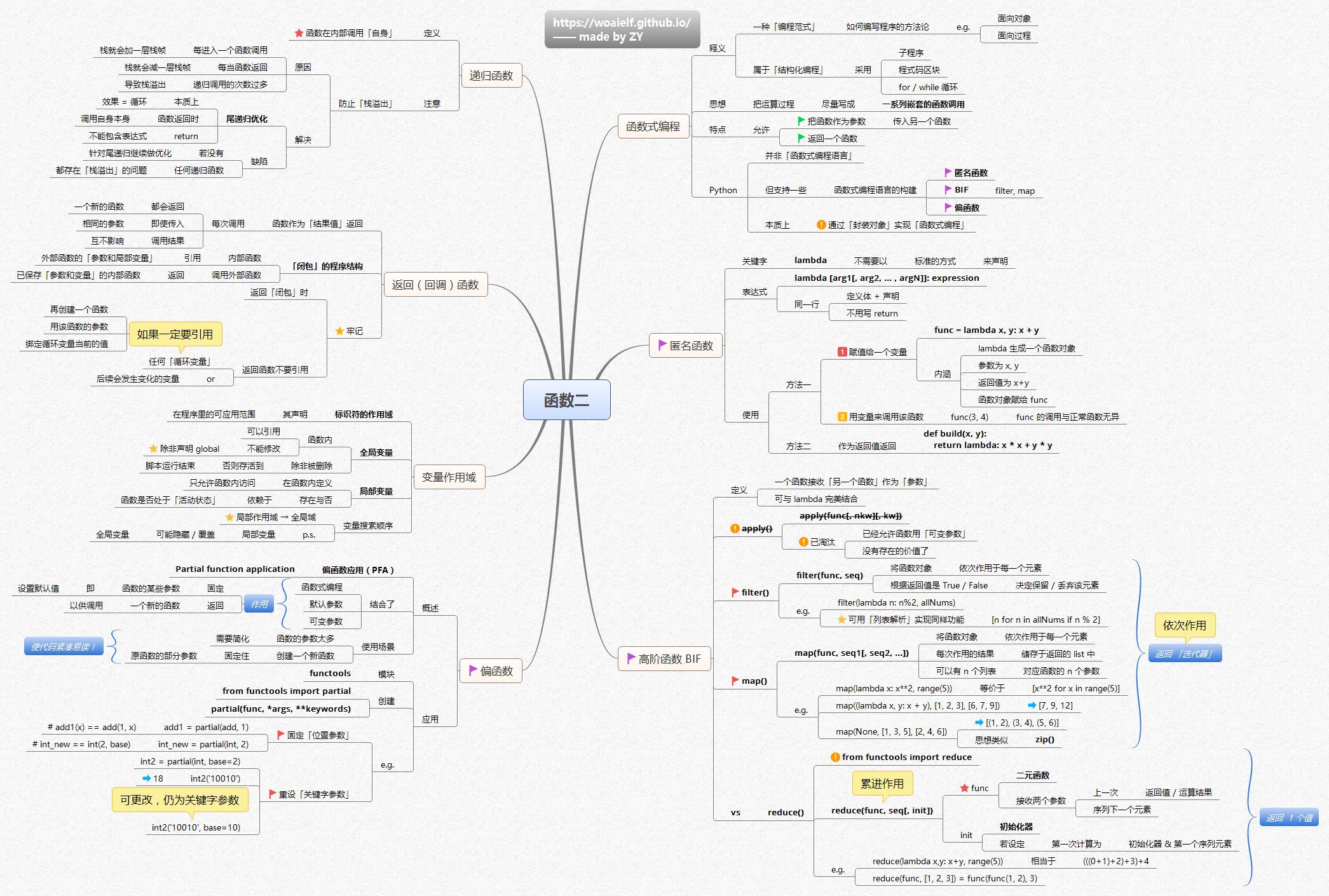 函数二图整理了递归函数、返回(回调)函数、变量作用域、偏函数、函数式编程、匿名函数、高阶函数BIF的详细介绍。