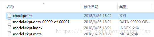 使用tf.train.saver()保持模型的时候会产生多个文件,会把计算图的结构和图上参数取值分成了不同文件存储,这种方法是在TensorFlow中最常用的保存方式: