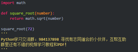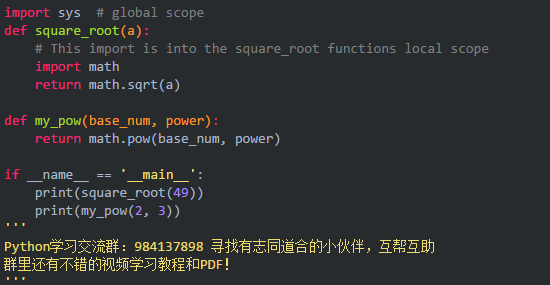 这里,我们将sys模块导入至全局作用域,但我们并没有使用这个模块。然后,在squareroot函数中,我们将math模块导入至该函数的局部作用域,这意味着math模块只能在squareroot函数内部使用。如果我们试图在my_pow函数中使用math,会引发NameError。试着执行这个脚本,看看会发生什么。