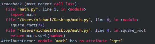 这到底是怎么回事?其实,你运行这个文件的时候,Python解释器首先在当前运行脚本所处的的文件夹中查找名叫math的模块。在这个例子中,解释器找到了我们正在执行的模块,试图导入它。但是我们的模块中并没有叫sqrt的函数或属性,所以就抛出了AttributeError。