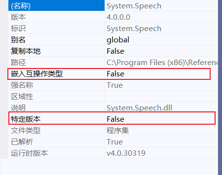 - 在项目引用中选中System.Speech,右键打开属性,将嵌入互操作类型及特定版本选为False,如下图所示