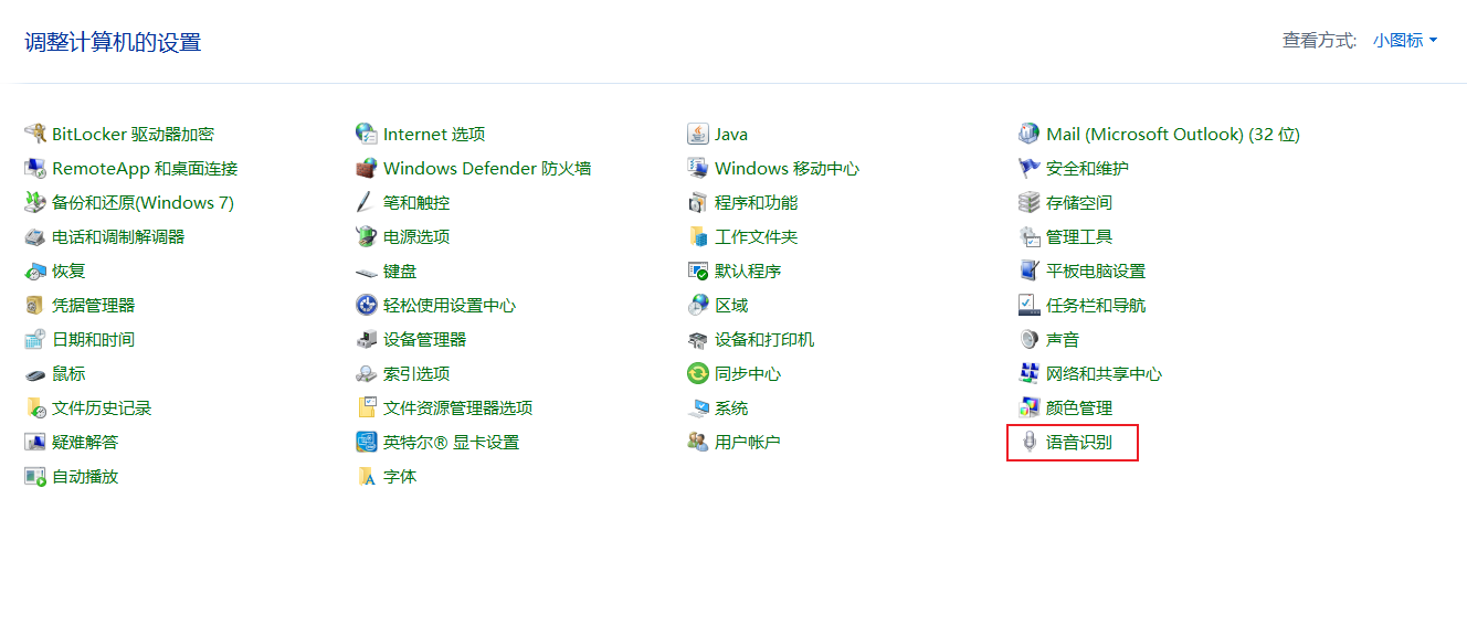 - 打开控制面板,切换为小图标,正常会看到语音识别图标,而功能缺乏的系统会找不到语音识别