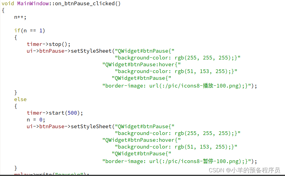 暂停按钮槽函数:通过一个全局变量n来完成暂停和恢复播放的功能,暂停时关闭定时器并且将按钮样式更换,恢复播放时重新打开定时器并将按钮样式更换回去