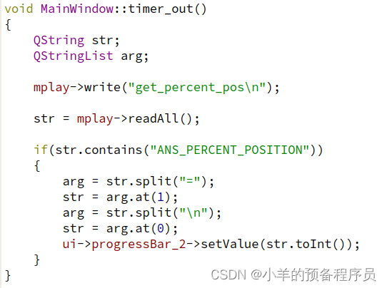 定时器函数:不断读取mplay的信息,得到百分比信息并分割,分割之后转化为整形通过ui->progressBar_2->setValue()让进度条实时更新