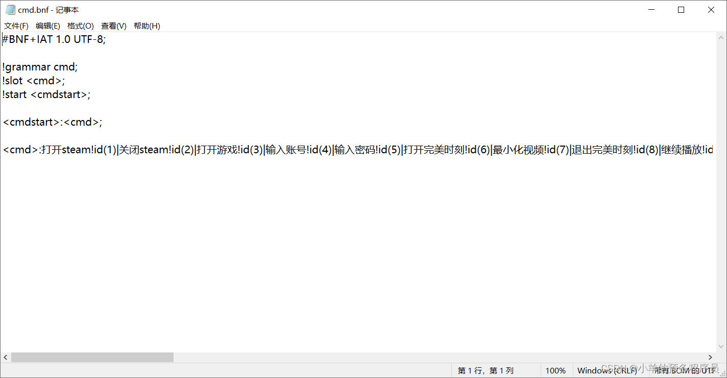 语音识别模块主要是根据CS架构实现的,在项目文件中x86binasr_record_demo为服务器代码,想要修改想要语音识别的内容可以修改x86bincmd.bnf下的内容,文件格式如下: