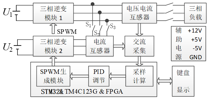 系统包括两个三相逆变模块、电压电流采样模块、主控模块及辅助电源,框图如下图所示。