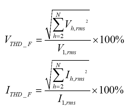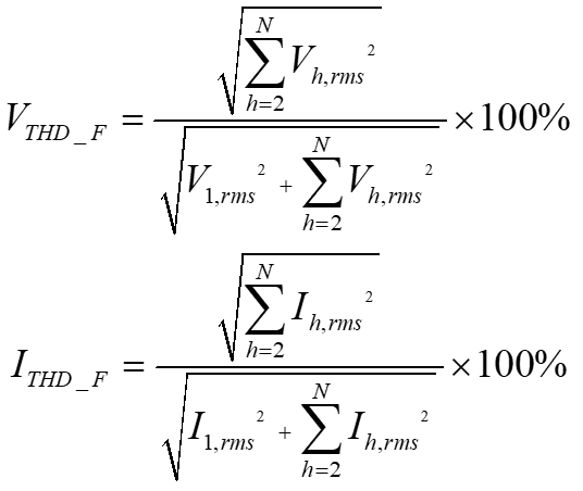 THD有两个常用的定义。在IEC 61000-4-7中,THD定义为指定次全部谐波分量均方根值与基波分量均方根值之比。下列公式用来计算电压和电流THD:
