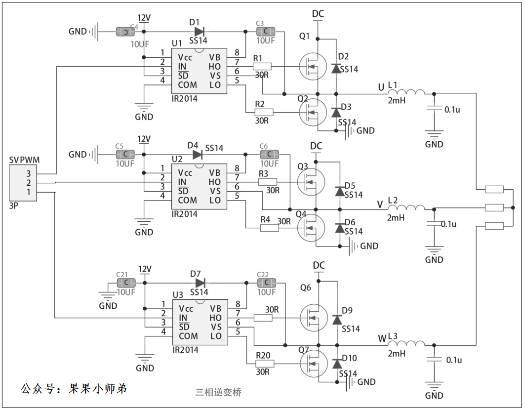 微电网模拟系统由三相逆变主电路、驱动电路、电压电流采样电路和控制电路组成,三相逆变电路由 6 个 N 沟道 MOS 管构成一个三相逆变桥,驱动电路采用六输出高压驱动器 IR2104。三相逆变电路由三路半桥电路和LC滤波电路组成。半桥电路中,驱动器IR2104在SVPWM波控制下驱动IRF3205通断,完成逆变。逆变输出电压经LC低通滤波器滤除高频载波,得到正弦交流电压。