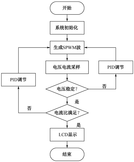 为满足采样、生成SVPWM波、稳压及分流等复杂功能,系统选用STM32作为系统控制器。系统控制分为两种模式,模式1仅有逆变器1工作,模式2是逆变器1、2并联工作。模式1、2的程序框图如下图所示。