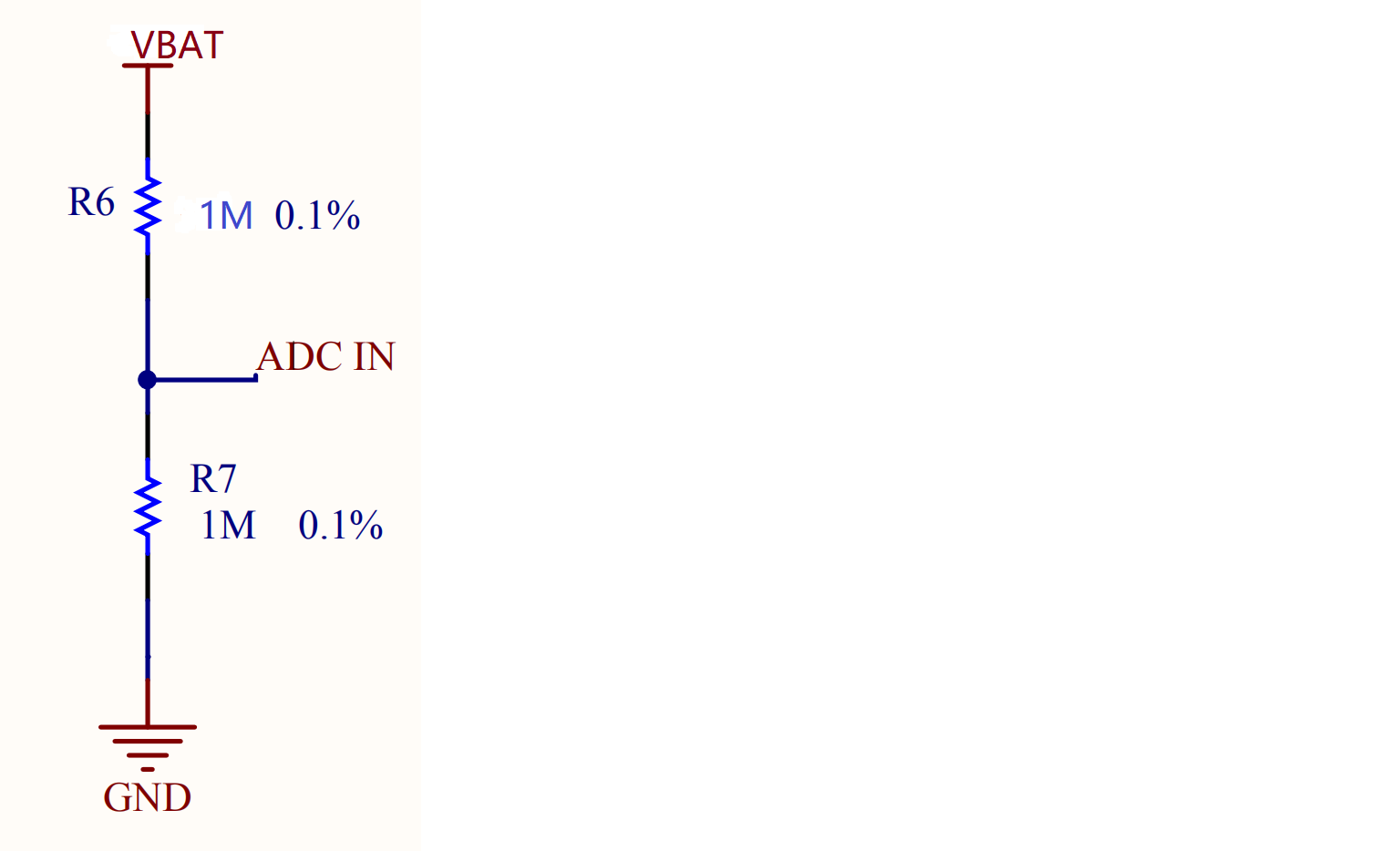 初始设计是用两个阻值相同电阻分压直接进行ADC采集,阻值1M,由该电路引起的待机电流为4.2/(1000 +1000)mA=2.1uA.此时比较合理。