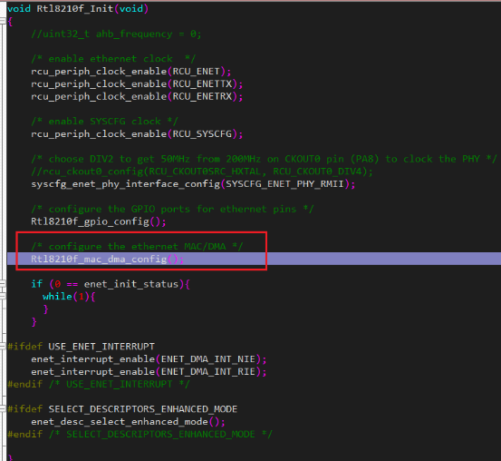 到这寄存器配置功能基本完成OK, GPIO引脚配置就不多说了,使用的是RMII模式,本来以为万事具备就差上电了,一上电我去卡住了,灯都没能点亮,Debug一步步发现卡在了Rtl8210f_Init函数里面了的Rtl8210f_mac_dma_config()函数,初始化MAC和DMA官方的怎么会呢,
