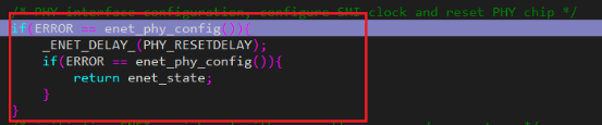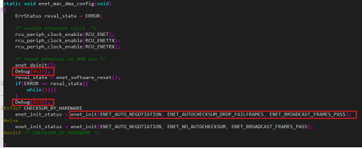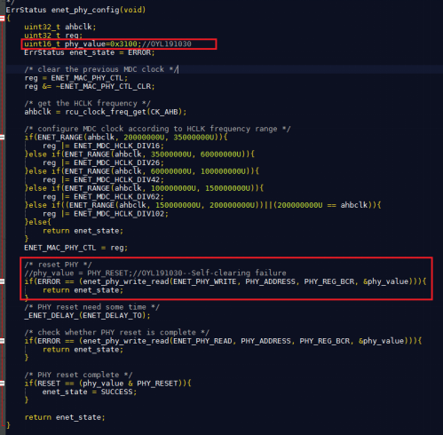 发现这里面有个while,很有可能了,但是加了串口Debug发现0x30可以打印,居然不是那只有最后一个函数了 enet_init();官方库寄存配置有点多啊,只能加串口Debug看卡在那了,发现卡在enet_phy_config()函数