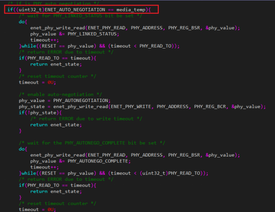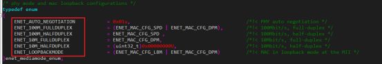 卡在这个if里面了,乍回事,自动协商模式过不去,那就不用它了,看看还有什么模式,如下还是有选择的,选择(ENET_100M_FULLDUPLEX)100Mbps 全双工模式,