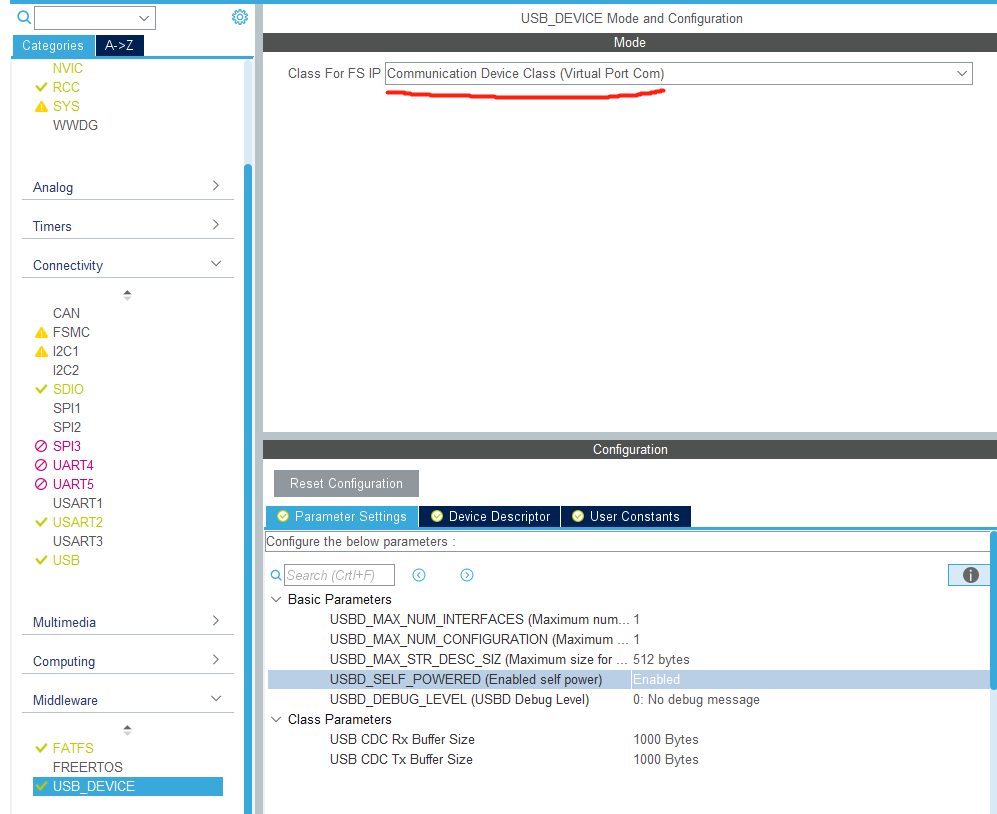 首先,配置cubemx,只需要修改中间层支持的类,原来是MSC,现在是CDC: