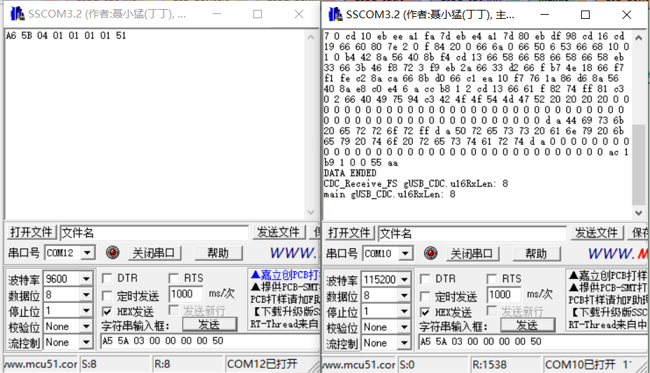 可以看到发送A5 5A 03 00 00 00 00 50,接收长度没错是8,+1后发送出来的也没错。