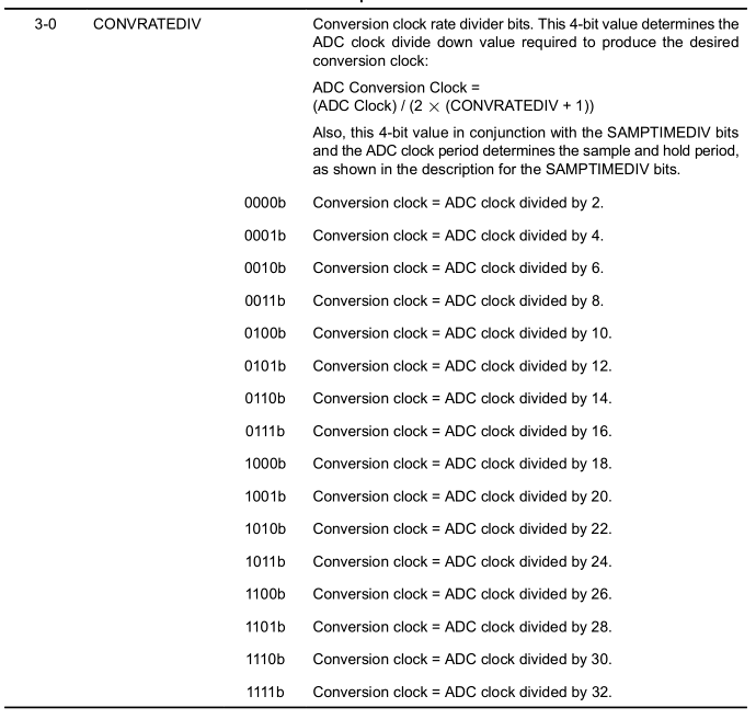 ADC 转换时钟 = (ADC Clock) / (2 * (CONVRATEDIV + 1)) [must be less than or equal to 2 MHz]