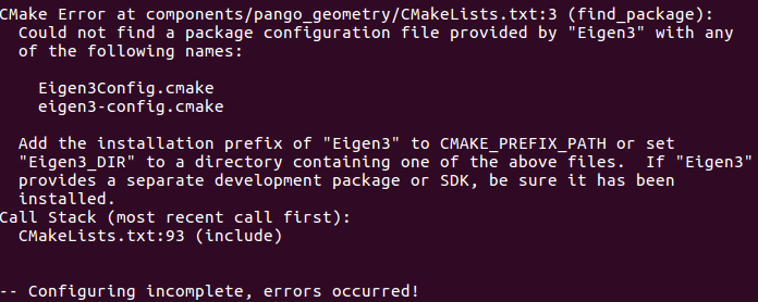 解决方法:先安装eigen ( 如下 sudo apt-get install libeigen3-dev)