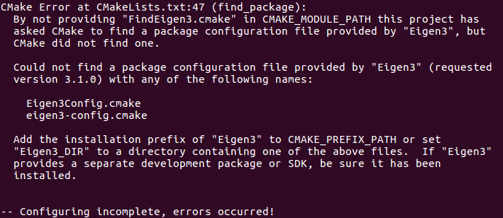 在台式机的双系统里边遇到的,错误不大,是漏装了一个库,但是由于eigen报warning(定义的变量未使用)太多,导致看不到真正的错误位置