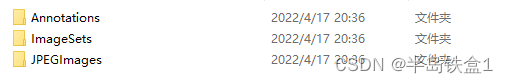 做好打标签的准备工作后,我们把图片按照如下格式存放,xml文件放在Annotations中,图片放在JPEGImages,ImageSets存放我们之后要说的划分的训练集和验证集。
