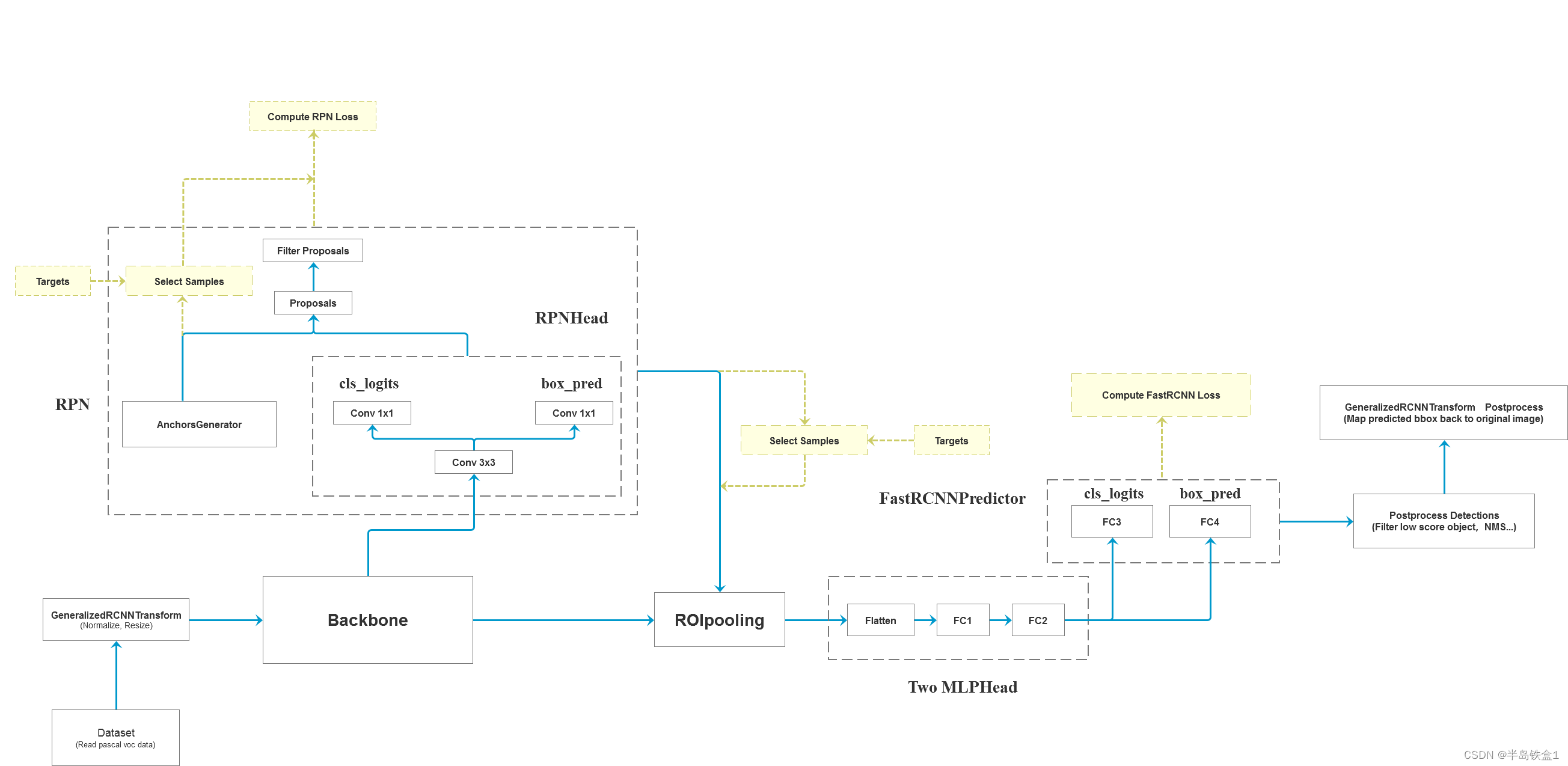 接下来我们就开始进入FasterRCNN的搭建过程,先附上该网络的框架图