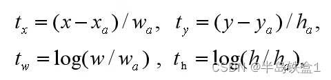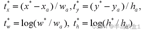 [8].结合anchors和与之对应的matched_gt_boxes计算regression参数,具体就是获取anchors的xy坐标和matched_gt_boxes的xy坐标这样就能得到各自的W和H与中心点坐标,根据下图公式(x*,y*对应matched_gt_boxes的中心点xy坐标、xa,ya对应anchors的中心点xy坐标、wa,ha对应anchors的长宽),就可以求得matched_gt_boxes(anchors对应真实gtbox)对应anchors的回归参数坐标(对应anchors的真实的边界框回归参数regression_targets)。