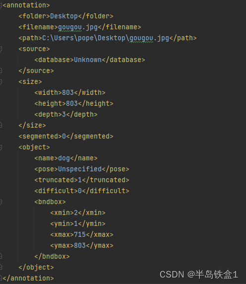 在打标签的过程中,还会生成图片的xml文件,它给出了框的坐标信息以及该照片的label信息dog