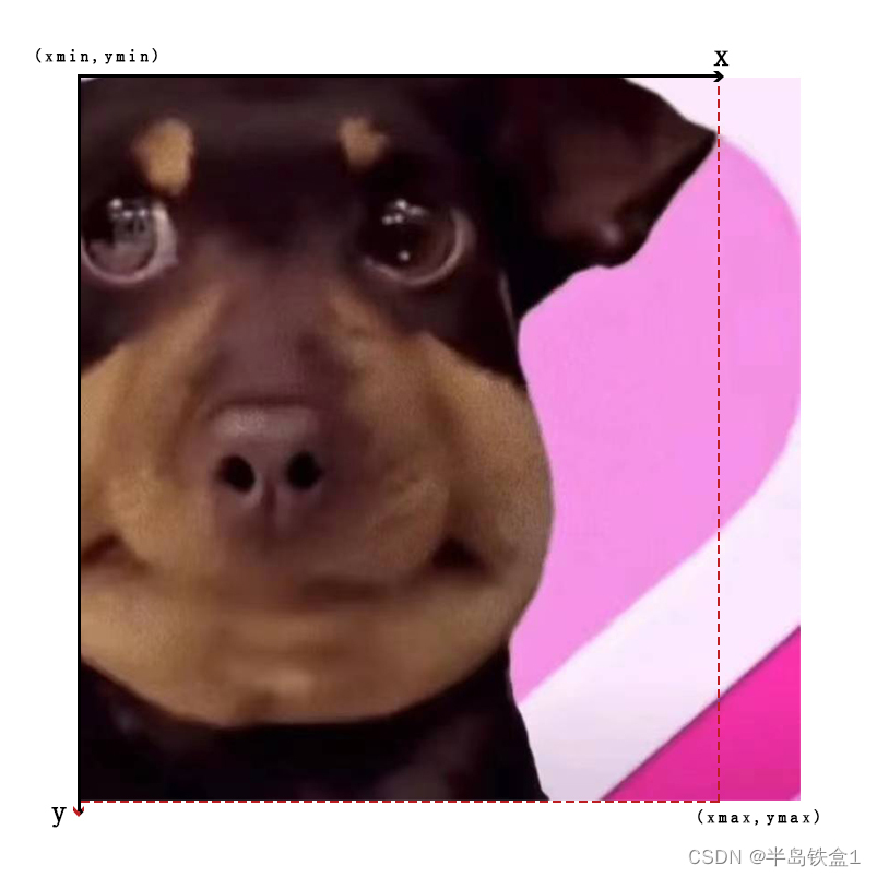 首先不同于目标分类任务仅需要对目标进行分类识别,Fasterrcnn网络属于目标检测任务,是识别出物体并对该物体描框以显示物体在图片中的位置,这个定位框有(xmin,ymin,xmax,ymax)四种属性,假设我们要识别的目标是一只狗,如图所示有四个坐标信息。